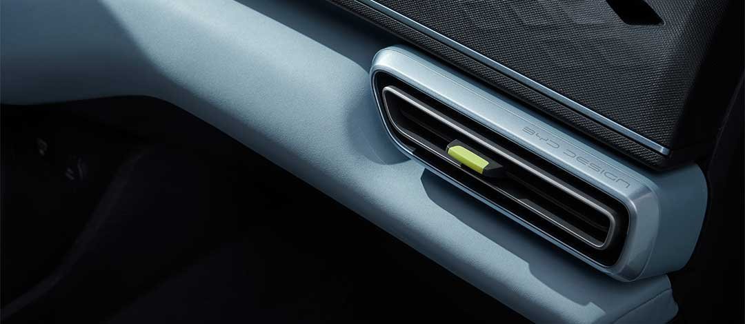 Ventilasi AC BYD Atto 1 bergaya cyberpunk dengan garis tegas dan sentuhan warna modern, menghadirkan suasana kabin yang futuristik, energik, dan berkarakter kuat.